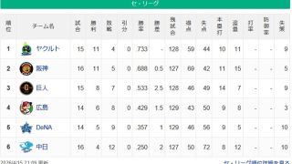 野球その他 【セ順位スレ】燕-虎-==兎-//=鯉=星==竜【4/15】