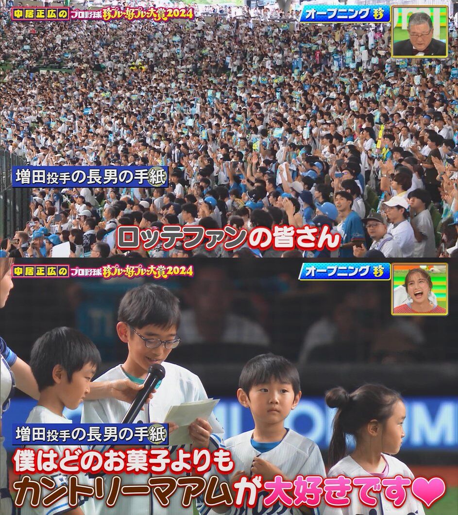 増田は9月28日ロッテ戦(ベルーナドーム)で引退試合が行われ、試合後のセレモニーでは4人の子どもたちが登場。長男が「ライオンズファンのみなさん、僕は埼玉西武ライオンズが大好きです。僕の大好きなパパ、増田達至を忘れないでください」と感動的なスピーチを見せると、最終盤に「ロッテファンのみなさん、ぼくはどのお菓子よりも、カントリーマアムが大好きです」とロッテファンの爆笑を誘った