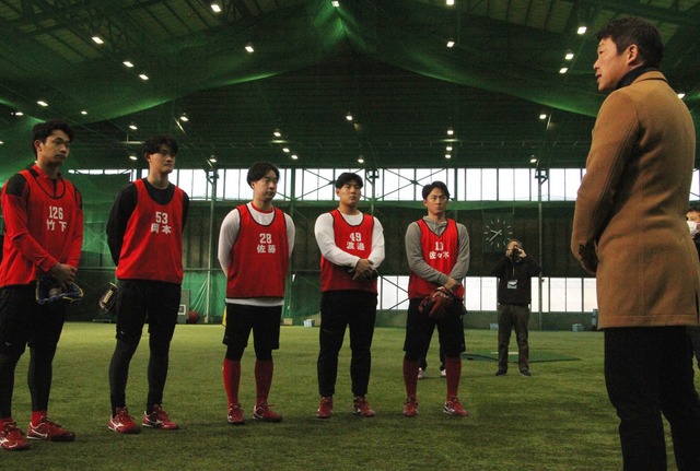 広島の新井監督が11日、広島県廿日市市の大野屋内総合練習場で行われている新人合同自主トレーニングを視察した。