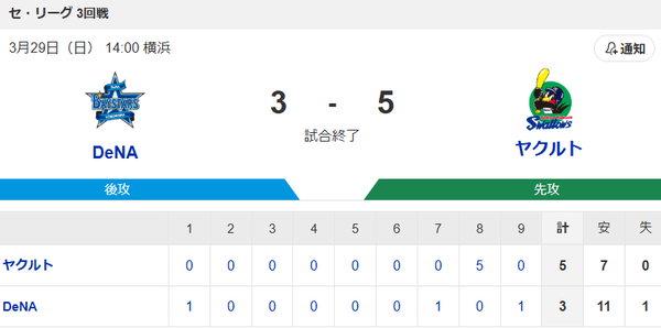 【試合結果】ヤクルト5-3横浜DeNA 逆転勝ち開幕3連勝!サンタナ3打点! スポンサーリンク 2026/03/30 09:48 【試合結果】ヤクルト5-3横浜DeNA 逆転勝ち開幕3連勝!サンタナ3打点! 353: 横3-5ヤ(9回裏) 26/03/29(日) 17:13:02 ID:vkIn すわほー!さ、三連勝!?!?!? [紹介元] ツバメ速報@ヤクルトスワローズまとめ 【試合結果】ヤクルト5-3横浜DeNA 逆転勝ち開幕3連勝!サンタナ3打点!