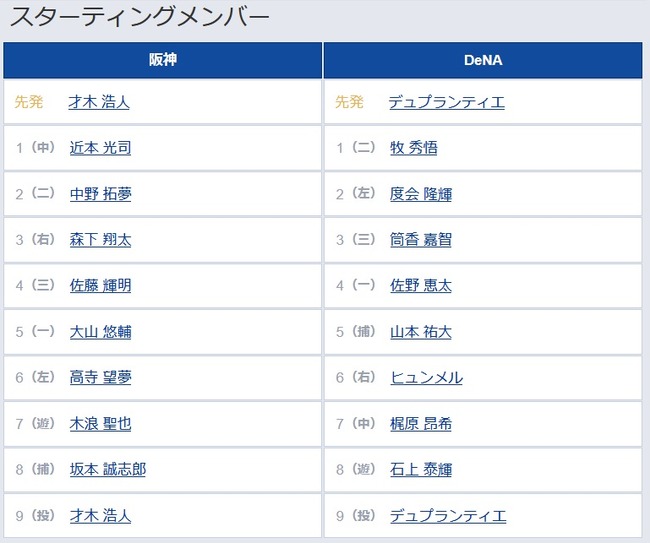 1(二) 牧 秀悟 2(左) 度会 隆輝 3(三) 筒香 嘉智 4(一) 佐野 恵太 5(捕) 山本 祐大 6(右) ヒュンメル 7(中) 梶原 昂希 8(遊) 石上 泰輝 9(投) デュプランティエ