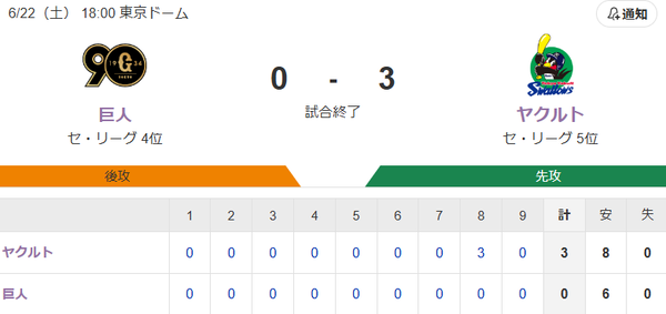 456: 巨0-3ヤ(9回裏) 24/06/22(土) 20:56:52 ID:5RJx