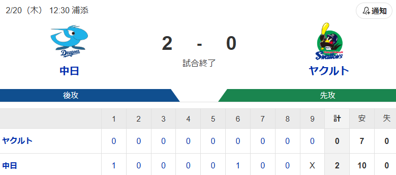 【試合結果】ヤクルト0-2中日 先発吉村2回1失点 村上にツーベース!