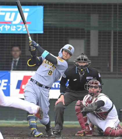阪神 佐藤輝明が驚きの一撃 弾丸ライナーで右中間後方のネットに突き刺す 全3打席で出塁「いい内容だったと思います」