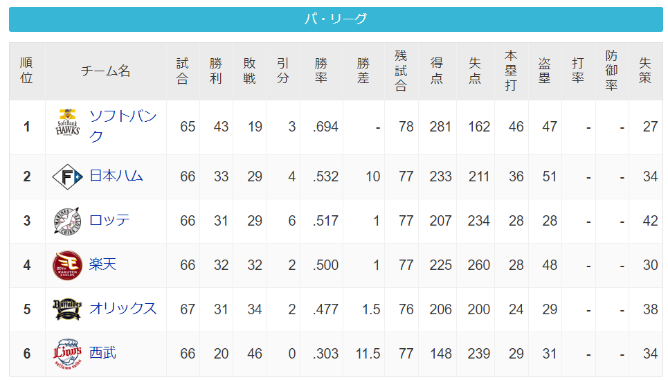 パーソル パ・リーグ 順位表 (6/23)⚾️