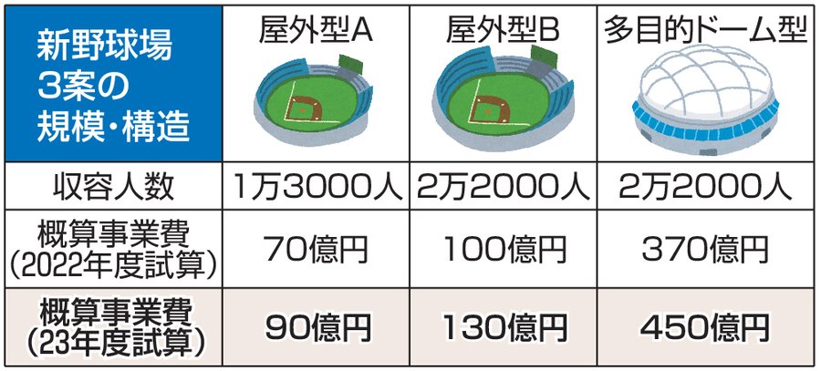 県は昨年7月に策定した基本計画に規模・構造が異なる三つの球場案を盛り込み、県市でつくる協議会で最適な案を検討している。現行の事業費は22年度に算出した数字で、23年度に実施した需要調査で物価上昇の影響などを踏まえて改めて試算したところ、おおむね2~3割膨らんだ。