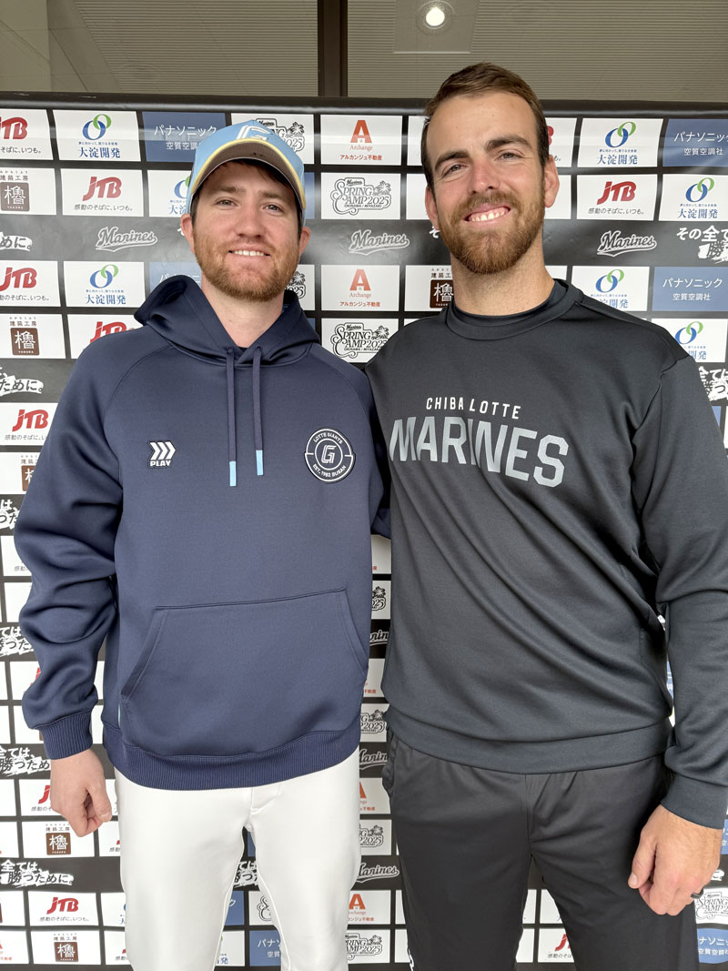 「ヘイ ブライアン!」。2月28日、宮崎県都城市の屋内練習場で2人は再会した。ブライアン・サモンズ投手と韓国プロ野球のロッテ・ジャイアンツに所属するチャーリー・バンズ投手は握手を交わした。サモンズは2017年にMLBのドラフト8巡目でミネソタ・ツインズに入団。バンズも同じ年のドラフト4巡目でツインズに入団した。同じ年の同期入団ということもあり、一緒にいる時間が多かった。そしてルームメートでもあった。2人は宮崎で行われた交流試合で久々の再会を喜んだ。