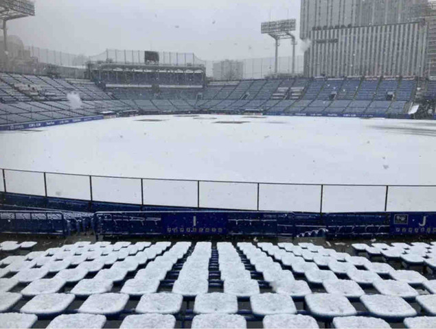 午後1時から予定されていたオープン戦阪神対ヤクルトは天候不良のため、中止となった。この日、神宮球場は突然の大雪で積雪。辺り一面真っ白の雪景色となった。