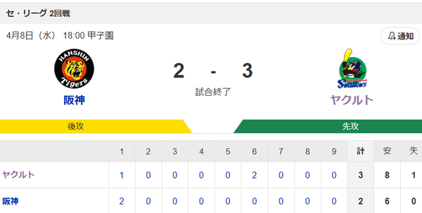 【試合結果】ヤクルト3-2阪神 増田赤羽タイムリーで逆転勝ち! スポンサーリンク 2026/04/09 14:48 【試合結果】ヤクルト3-2阪神 増田赤羽タイムリーで逆転勝ち! 355: 神2-3ヤ(9回裏) 26/04/08(水) 21:28:54 ID:VHe0 よっしゃ! [紹介元] ツバメ速報@ヤクルトスワローズまとめ 【試合結果】ヤクルト3-2阪神 増田赤羽タイムリーで逆転勝ち!