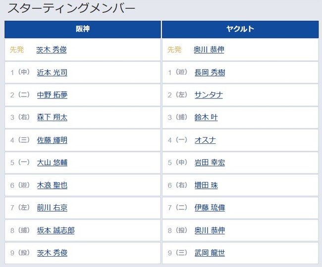 502: どうですか解説の名無しさん 2026/04/09(木) 17:16:43.48 ID:5O06eusx0 1(遊) 長岡 秀樹 2(左) サンタナ 3(捕) 鈴木 叶 4(一) オスナ 5(中) 岩田 幸宏 6(右) 増田 珠 7(二) 伊藤 琉偉 8(投) 奥川 恭伸 9(三) 武岡 龍世