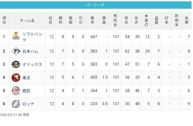 2: 名無し 2026/04/09(木) 21:57:41.627 ID:UUGrAePzl ヤクルトだけ上振れてるな