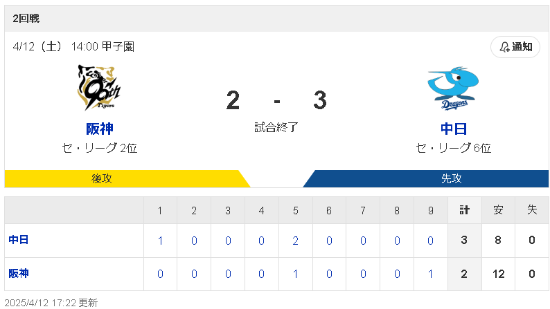 阪神 0 0 0  0 1 0  0 0 1 |2