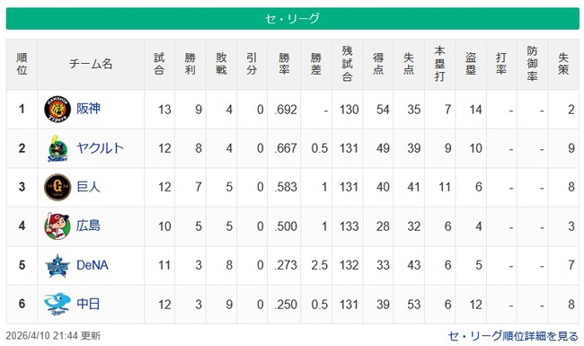 転載元: https://hayabusa.open2ch.net/test/read.cgi/livejupiter/1775824969/https://baseball.yahoo.co.jp/npb/standings/