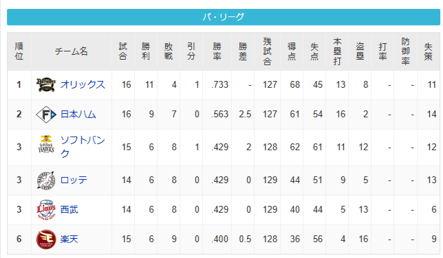 パーソル パ・リーグ 順位表 (4/16)⚾️