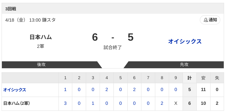 【2軍 日本ハムvs.オイシックス】6-5で勝利!