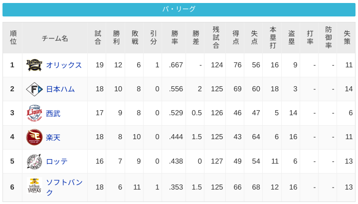 パーソル パ・リーグ 順位表 (4/19)⚾️