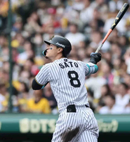 阪神・佐藤輝がリーグ単独トップの7号3ランを放った。3-0の五回1死二、三塁。2番手の鈴木からバックスクリーン左へ放り込んだ。甲子園は大歓声に包まれた。