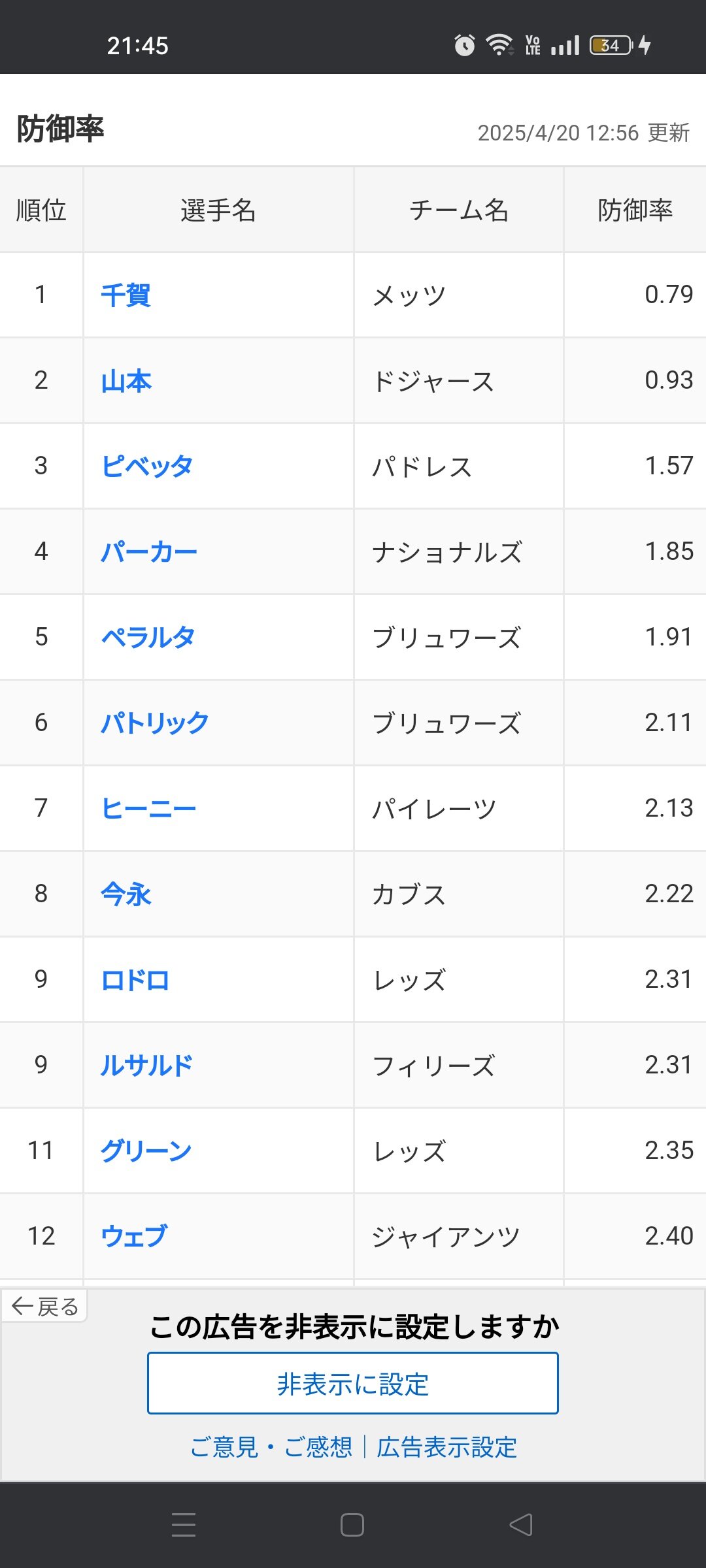 ナ・リーグ防御率ランキング 千賀 1位 0.79 山本 2位 0.93 スポンサーリンク MLB 2025/04/21 08:03 ナ・リーグ防御率ランキング 千賀 1位 0.79 山本 2位 0.93 1: 2025/04/20(日) 21:47:50.18 ID:R5h6ZVc10 続きを読む