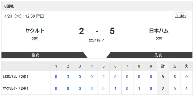 【2軍 ヤクルトvs.日本ハム】2-5で勝利!