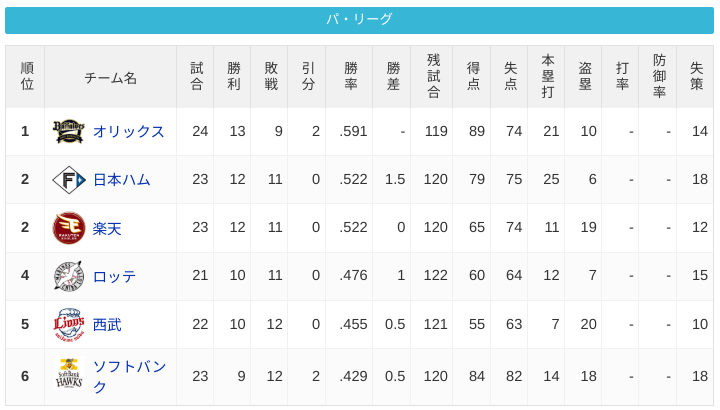 パ・リーグ 順位表 (4/26)