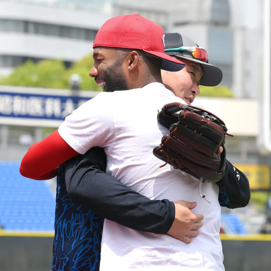 レンジャーズ傘下でチームメートだった #ファビアン 外野手とDeNA・#筒香嘉智 外野手は熱き抱擁👍📸#伊藤笙子