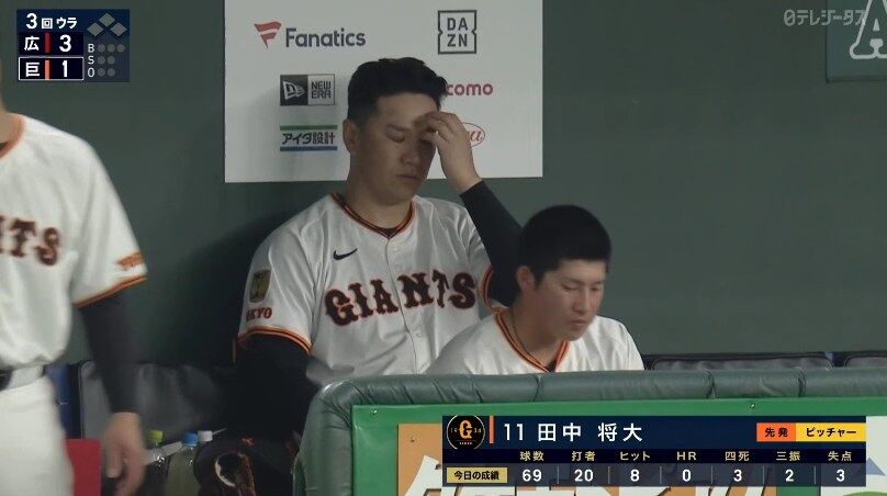 【巨人対広島6回戦】巨人 田中将大が3回3失点KO 日米通算199勝目はならず 初回5連打で一挙3失点 三回は満塁のピンチ凌ぐも
