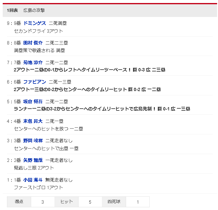 1番・小園は初球スプリットで一ゴロ、2番・矢野は7球目の外角低めスライダーで見逃し三振に斬って取り、順調に立ち上がったかに見えた。