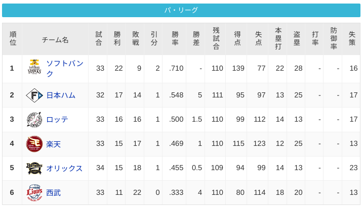 パーソル パ・リーグ 順位表 (5/10)⚾️