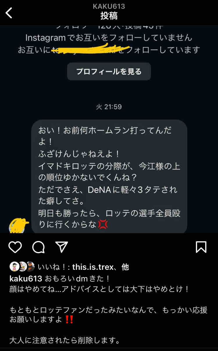 インスタでアンチに絡まれた角中「大下はやめとけ!」 スポンサーリンク 千葉ロッテマリーンズ 2024/06/27 11:13 インスタでアンチに絡まれた角中「大下はやめとけ!」 23: どうですか解説の名無しさん 2024/06/27(木) 02:19:31.91 ID:H5u5a8600 角中がインスタでアンチに絡まれてるw この投稿をInstagramで見る 角中勝也(@kaku613)がシェアした投稿 続きを読む