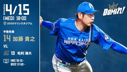 [紹介元] ファイターズ王国@日ハムまとめブログ 【予告先発】加藤貴之|4月15日 ロッテ戦|18:00開始