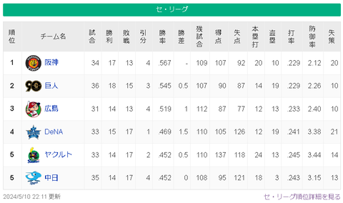 【5/10】神-巨=広-/=横-ヤ中【順位スレ】 スポンサーリンク 中日ドラゴンズ 2024/05/11 00:06 【5/10】神-巨=広-/=横-ヤ中【順位スレ】 (出典 ●●●中日●●●東京●●横浜 広島○読売○○○阪神○○○○) 1 それでも動く名無し 警備員[Lv.15(前21)][苗] :2024/05/10(金) 21:47:16.07 ID:G+P6bAYt0 阪神○○○○ 読売○○○ 広島○ 横浜●● 東京●●● 中日●●● 福岡○○○○○○○○○○○○○ 日公○○○ 千葉 楽天●● 檻牛●●● 西武●●●●●●●●●●● (出典 ●●●中日●●●東京●●横浜 広島○読売○○○阪神○○○○) 続きを読む