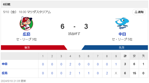 広島 0 0 0 2 1 1 0 2 X |6