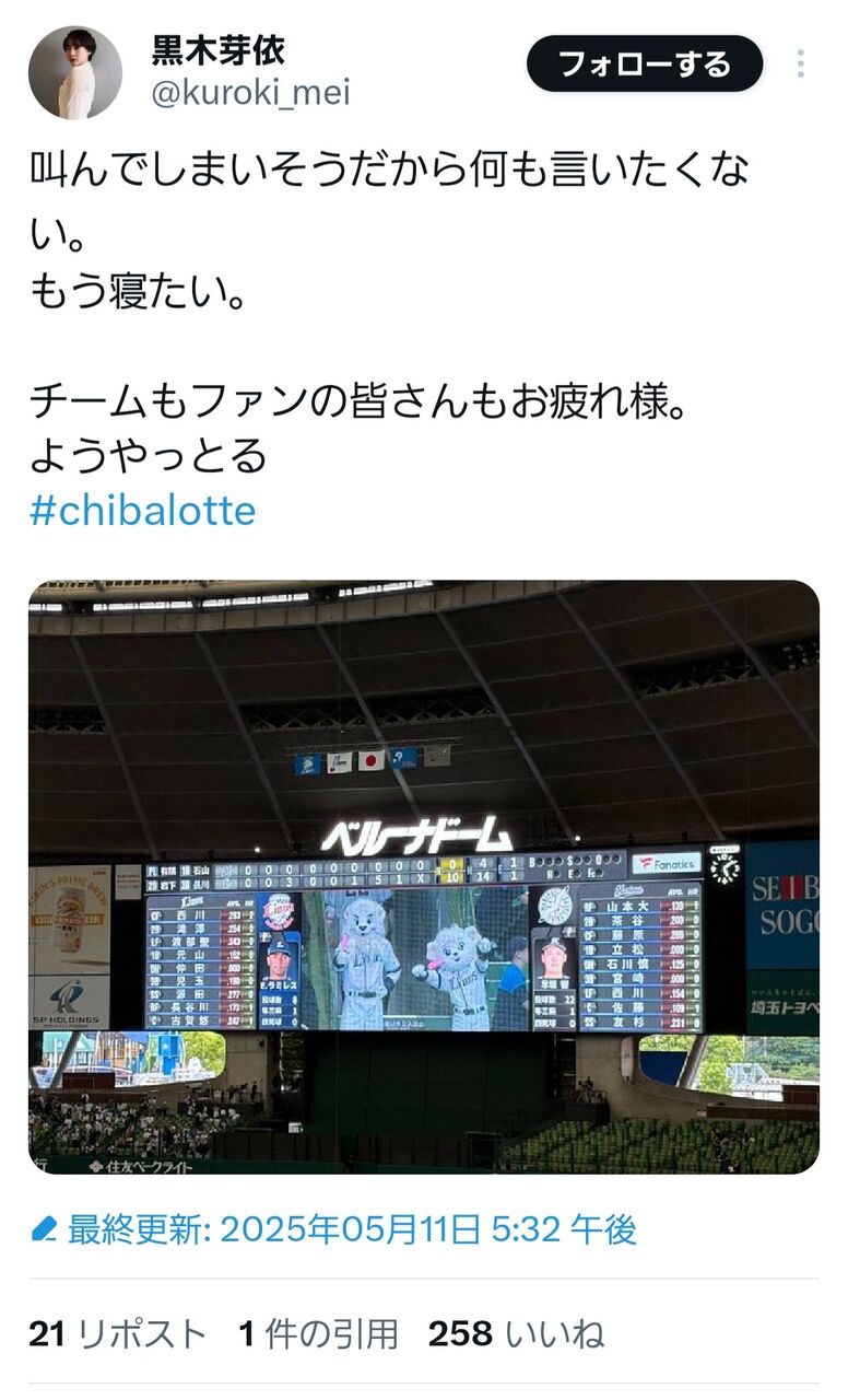ようやっとる#chibalotte pic.twitter.com/QtD5Jk2geQ— 黒木芽依 (@kuroki_mei) May 11, 2025