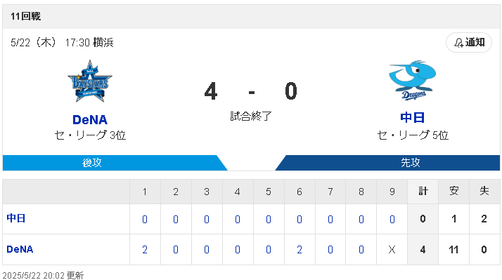 DeNA   2 0 0  0 0 2  0 0 X |4