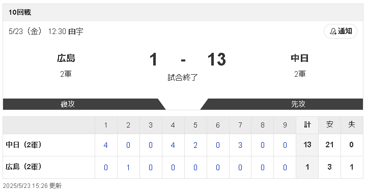 ◇23日 ウエスタン・リーグ 広島1―13中日(由宇)