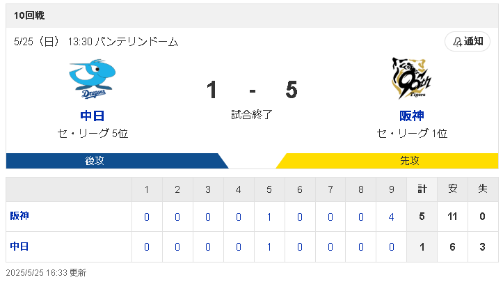 阪神 0 0 0 0 1 0 0 0 4 |5