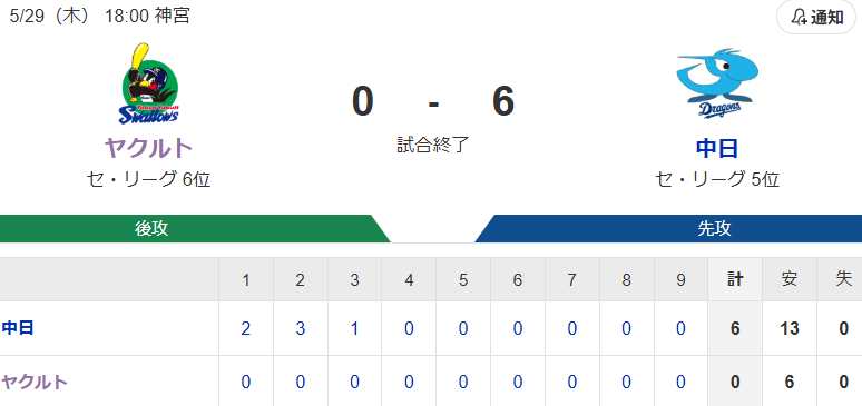 【試合結果】ヤクルト0-6中日 小川5回6失点 完封負け