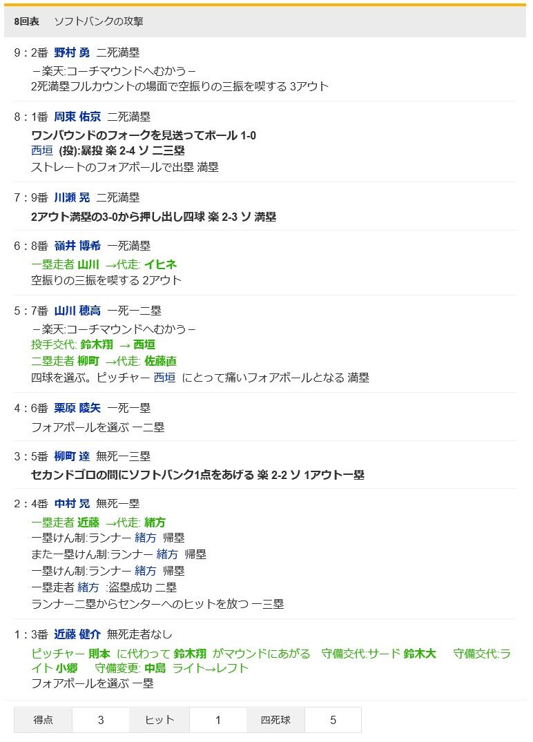 SB7回裏に1点勝ち越される→雨で中断→8回表に3点とって逆転