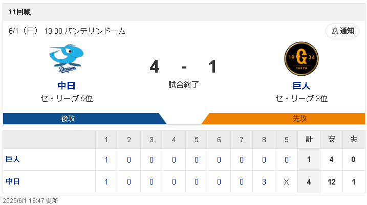 試合結果:nikkansports.com/yahooスポナビ野球