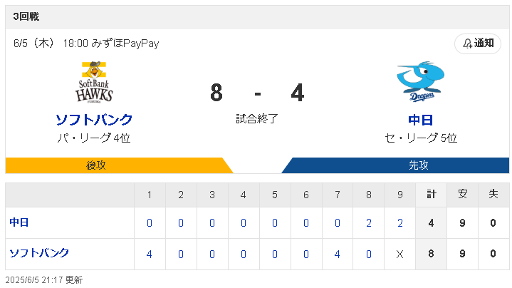 ソフトバンク 4 0 0 0 0 0 4 0 X|8
