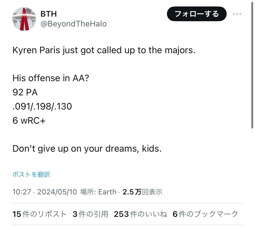 俺達のエンゼルス、とんでもない選手をメジャーに昇格させる スポンサーリンク MLB 2024/05/11 23:43 俺達のエンゼルス、とんでもない選手をメジャーに昇格させる 1: 2024/05/11(土) 03:41:55.50 ID:IRKklI3O0 2AでwRC+6はいかんでしょ 続きを読む