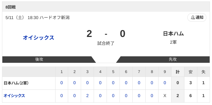【2軍オイシックスvs.日本ハム】0-2で負け