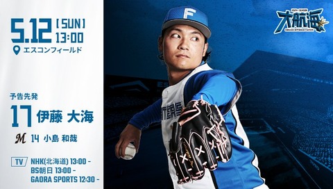伊藤大海 5月12日のロッテ戦 予告先発! 13:00~