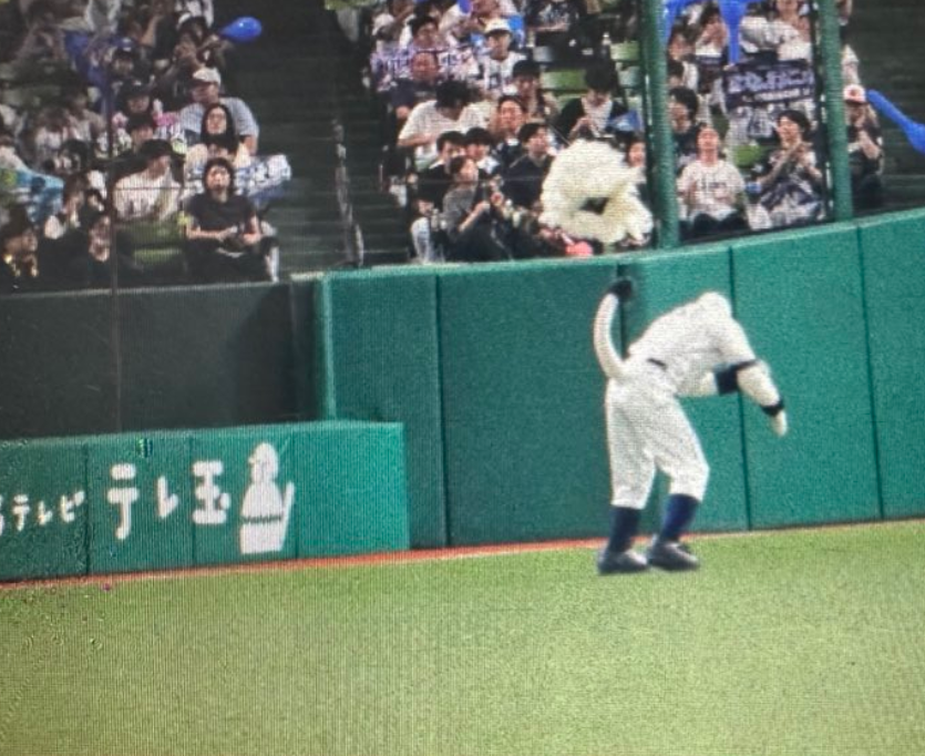 西武の球団マスコットであるレオが、左翼の人工芝部分で3連続でバック転を見事に決めた瞬間、なんと頭のかぶり物が