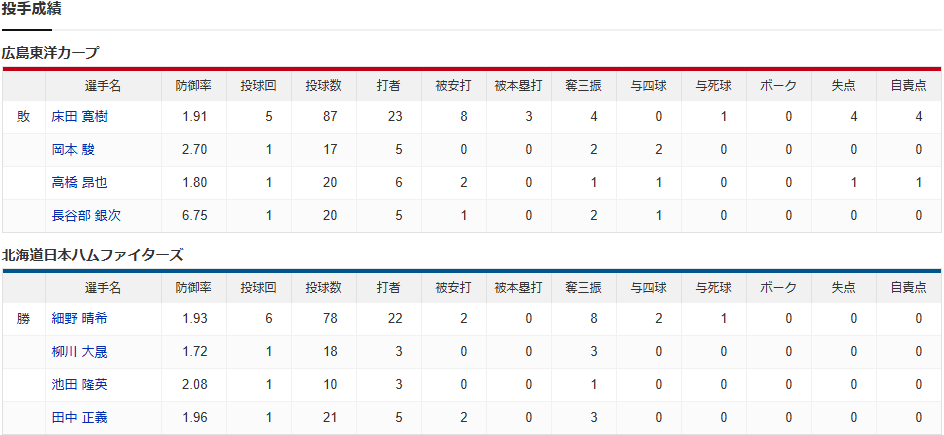 広島のエスコン連勝は「4」でストップ 日本ハム・細野にプロ初勝利を献上 床田が3被弾を浴びるなど5回4失点で5敗目