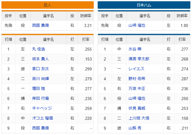 【巨人vs.日本ハム 2回戦】1(中)水谷瞬 2(三)清宮幸太郎 3(一)レイエス 4(左)野村佑希 18:00〜