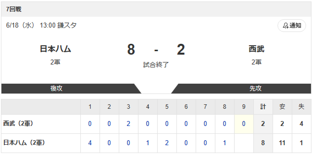 【2軍 日本ハムvs.西武】8-2で勝利!