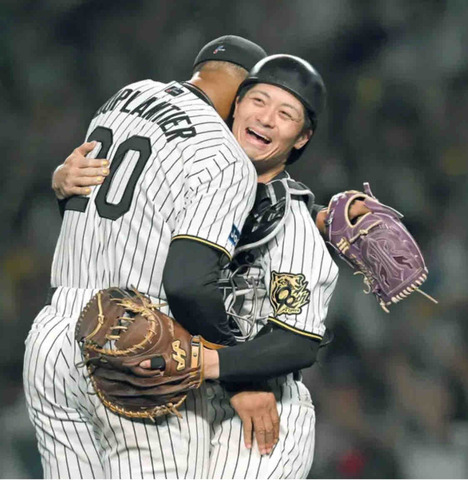109球目の投球をミットに収めると、右拳を握ってマウンドへと駆け寄った。女房役の阪神・坂本誠志郎捕手にとっても完封勝利は格別の味。「デュプランティエさまさまだと思います」。熱く抱き合い、お立ち台ではお互いにべた褒め。「配球の天才」と称されると、照れくさそうに笑いをこらえた。