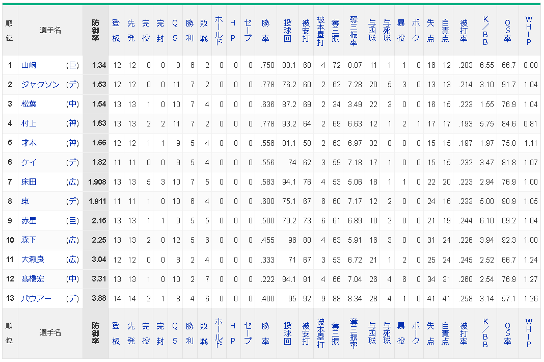 【悲報】DeNAバウアーさん、リーグ規定投球回到達者14人中防御率最下位www