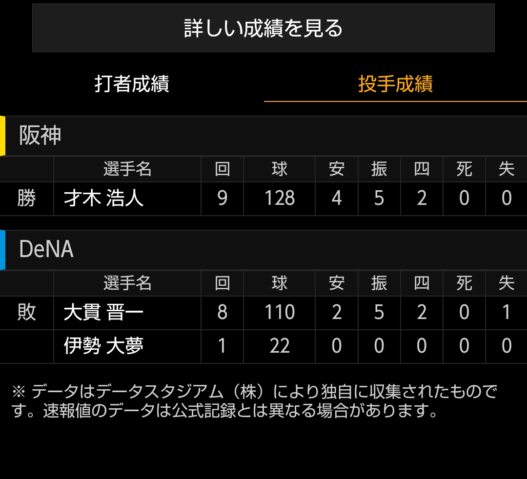 ベイスターズ 0-1 タイガース 大貫8回1失点の好投も、打線が才木を攻略出来ず完封負け